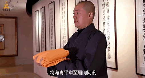 1双手食指与中指扣住海青,持于胸前2将海青平举至眉间问讯,表示恭敬3右手找到衣领,左手轻轻放开,让海青自然展开4