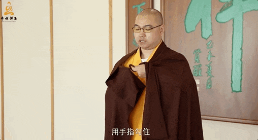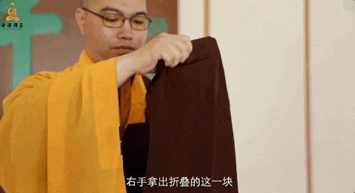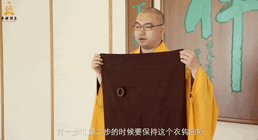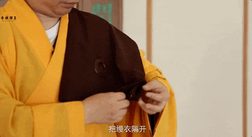1 将缦衣举至齐眉处问讯后,将衣放在左手,散边朝外,用右手翻开 2 右手抓住缦衣右上角,以左手抓住缦衣右下角提起 3 缦衣共有四层,在右手协助下,用左手四个手指将四层缦衣隔开并夹住 4 然后拿到脖子后面,右手接过左手拇指与食指夹住的那一片,把缦衣拉开披在身上 5 披好后,用手指勾住扣环 6 右手抓住海青的袖子,由内向外伸出来 7 然后把扣环扣好,并调整好环扣的位置 8 按照缦衣原有的折痕,取适当位置对折 9 将袖子整理好,持于左手上,做抄手姿势