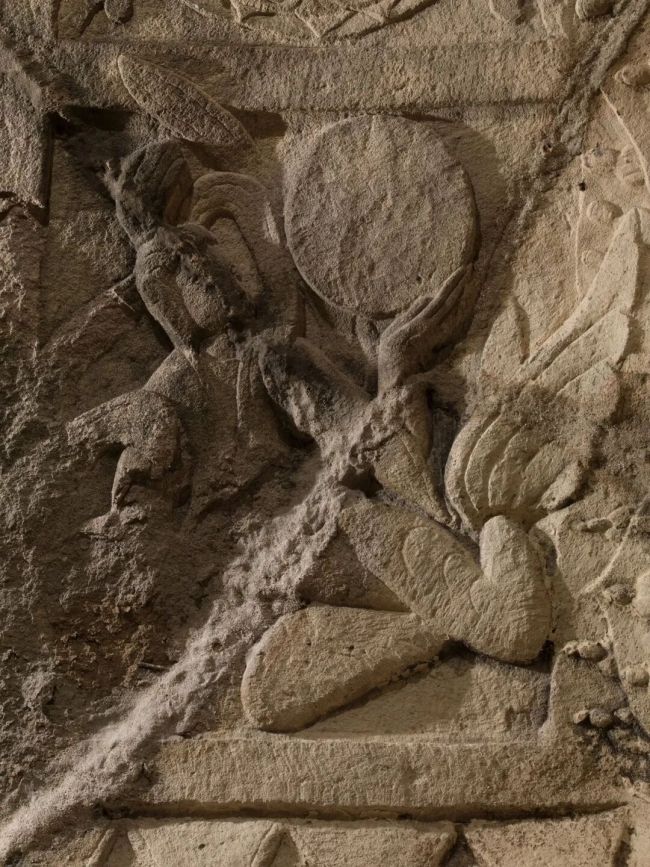 第8 窟窟门西侧五头六臂的鸠摩罗天造像和东侧三头八臂的摩醯首罗天,是云冈石窟中“日月同现” 的两尊代表性形象,其中 “月” 作为造像的重要装饰与神性象征,直接承载在神祇的手臂之上,象征护法祛邪。其中,鸠摩罗天乘着孔雀,其中一只手托举着日,另一只手托举着月,月亮以简洁的圆形造型呈现,与太阳对称分布,从另一种维度展现了云冈石窟对“月” 元素的运用。