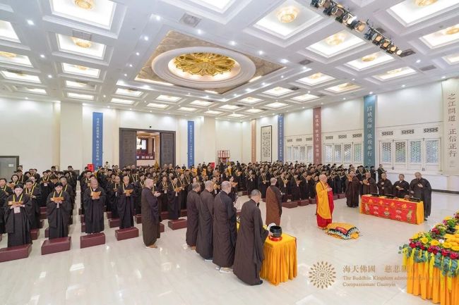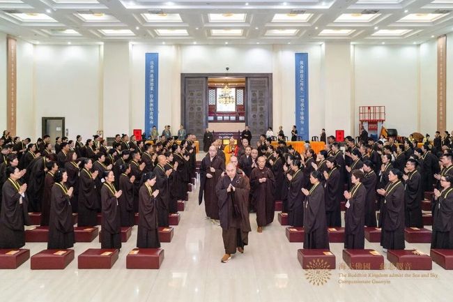 2025年9月28日(乙巳年八月初七),“佛法僧三宝,众生良福田,若能持净戒,利乐诸人天”,普陀山佛教协会乙巳年秋传授三皈五戒法会圆满。法会礼请中国佛教协会副会长、普陀山佛教协会会长、普济禅寺方丈上道下慈大和尚担任三皈五戒本师,古草茅篷负责人礼贤法师担任五戒羯磨阿阇黎,普陀山佛教协会弘法办副主任、白华禅院监院宏海法师担任五戒教授阿阇黎。来自全国各地约二百位善信檀越在会长道慈大和尚的引导下,至心皈依三宝,发愿受持五戒,正式成为三宝弟子,法会现场清净庄严。