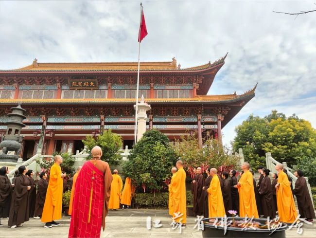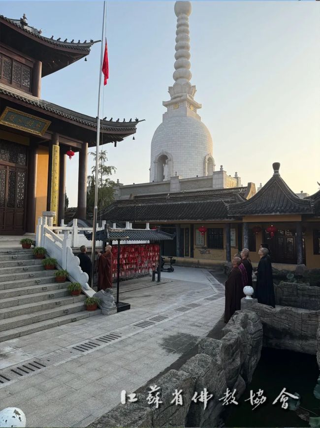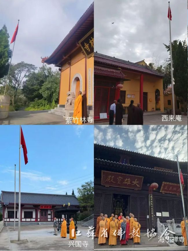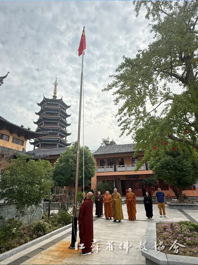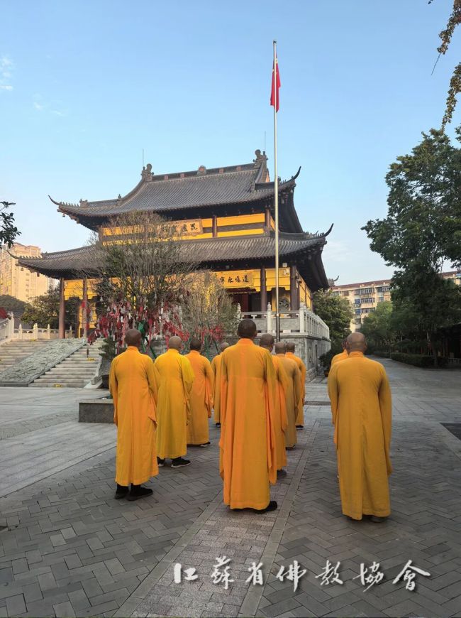 盛世庆华诞,同心向未来。为热烈庆祝中华人民共和国成立76周年,2025年10月1日清晨,江苏省各佛教活动场所、佛学院纷纷举行升国旗仪式。
