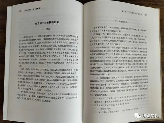 5、关于世界和平者。法舫从两个方面进行阐述,一方面是阐述世界战争的根源。“地球上有无数之民族,有无数之国家,各国民性不同,故各国之政治亦异,各民族之风习不一,故各民族之信仰亦别,政治异故,文化信仰等亦异焉。此国与彼国相往来者,乃谋国与国之亲善互助,以发展人类之道德,而促进人类之安乐,世界之和平者也。然因人类自我执见之过高,故一切所为,均以我为出发点,首之为我身,次之为我家,次为我亲族,次为我团体,次为我国家,我之所为,至国家而极大矣。从为小我之身,至为大我之国,充满于人类之心田者,我而已矣。依群众之心理观之,凡家庭意识,社会意识,国家意识乃至世界意识,亦皆我而已矣。由为我故,不顾他人,为我国故,亦不顾他国,凡利于吾国家之事,虽损害他国之一切生命财产,亦不惜而为之。世界之侵略主义与被侵略民族之痛苦,由斯露骨。世界国际之不太平,民族生存之互相竞争,文明物质之互相掠夺,文化经济之互相侵略,从此人类之道德性全盘丧失。目的不达,则动以武力,而求足其侵略之欲望,安慰其自我之目的,世界之国与国相斗,而惨杀无量不可说之人类,而损失无量不可说之财产,厥为此也。然如是之现势露表于目前者,即今日之国际情势,人类大劫,固及亟亟临而可畏,佛教之救济,推其使命,问其责任,固亦应速为挽救者也”。另一方面阐述佛教是为世界和平而出世。“世界和平在佛教教典中,任何经论中,皆具说之,即就佛教之出世目的论,佛教原为世界和平而出世,为救济世界人类而产生,其所救济者,乃谋根本之救济。如破除自我也,慈爱众生也,不分国家而普度一切人类也,乃至不分种姓性别情非情等也,佛教之一切事业盖无非世界之和平运动也。”法舫说:“圣言量者,如佛教诫各国王所说之治国方法,智者研寻,不能广引。”[ 《法舫文集》四卷117-118页《依据圣言量来建立人间佛教》]