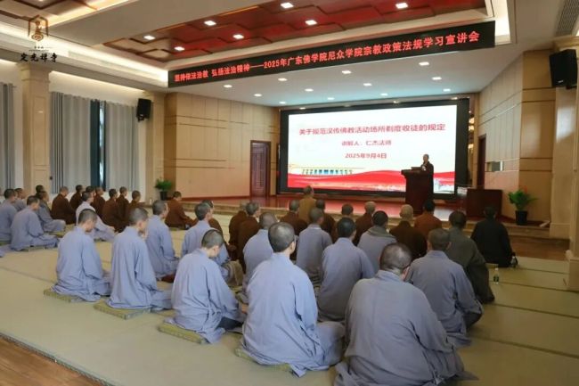 为深入贯彻习近平法治思想,落实全面从严治教要求,弘扬社会主义法治精神,2025年9月4日,广东佛学院尼众学院举行“2025年法治宣传月”宗教政策法规学习宣讲会。组织全体师生对《关于规范汉传佛教活动场所剃度收徒的规定》《全国汉传佛教院校教师资格认定办法实施细则》《全国汉传佛教院校教师职称评审办法实施细则》《全国汉传佛教院校学衔授予办法实施细则》等多项佛教重要政策法规进行了专题学习。