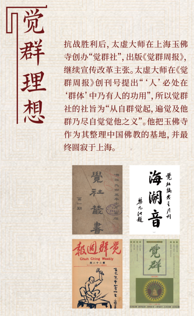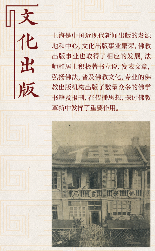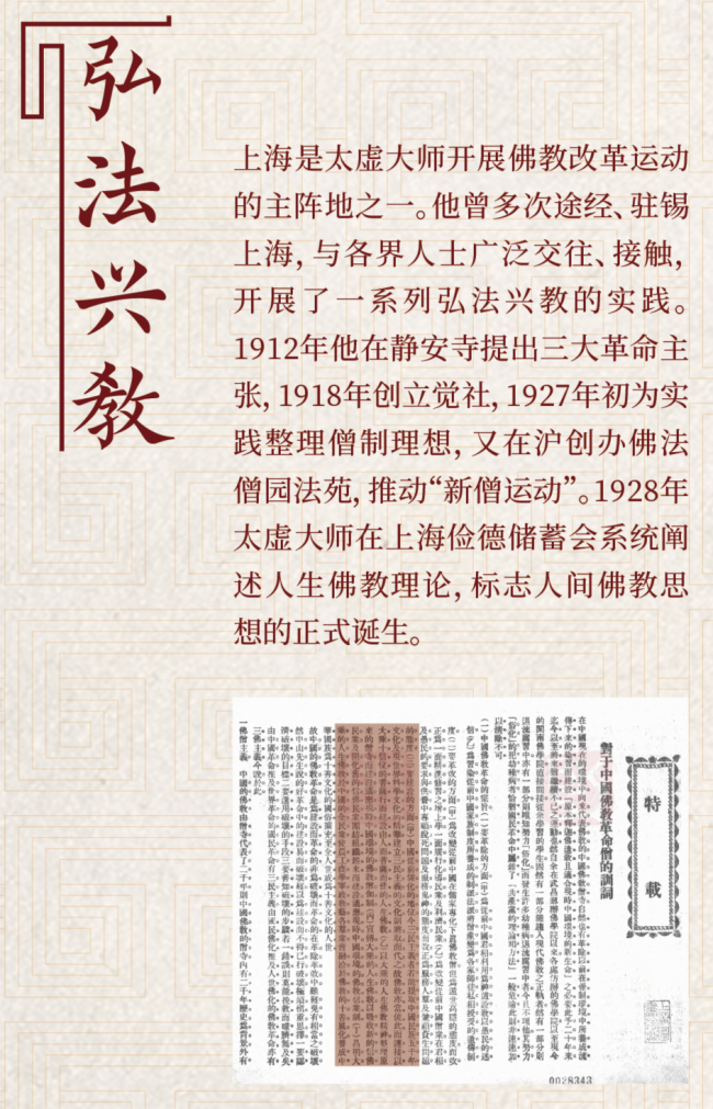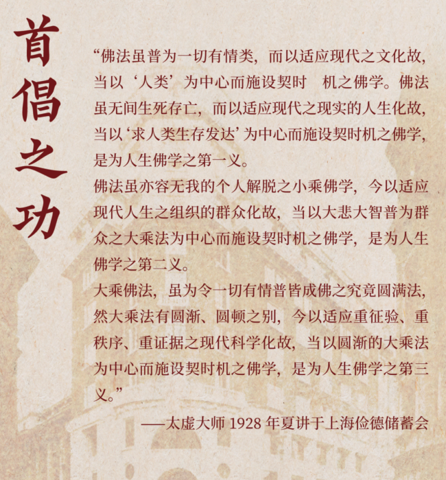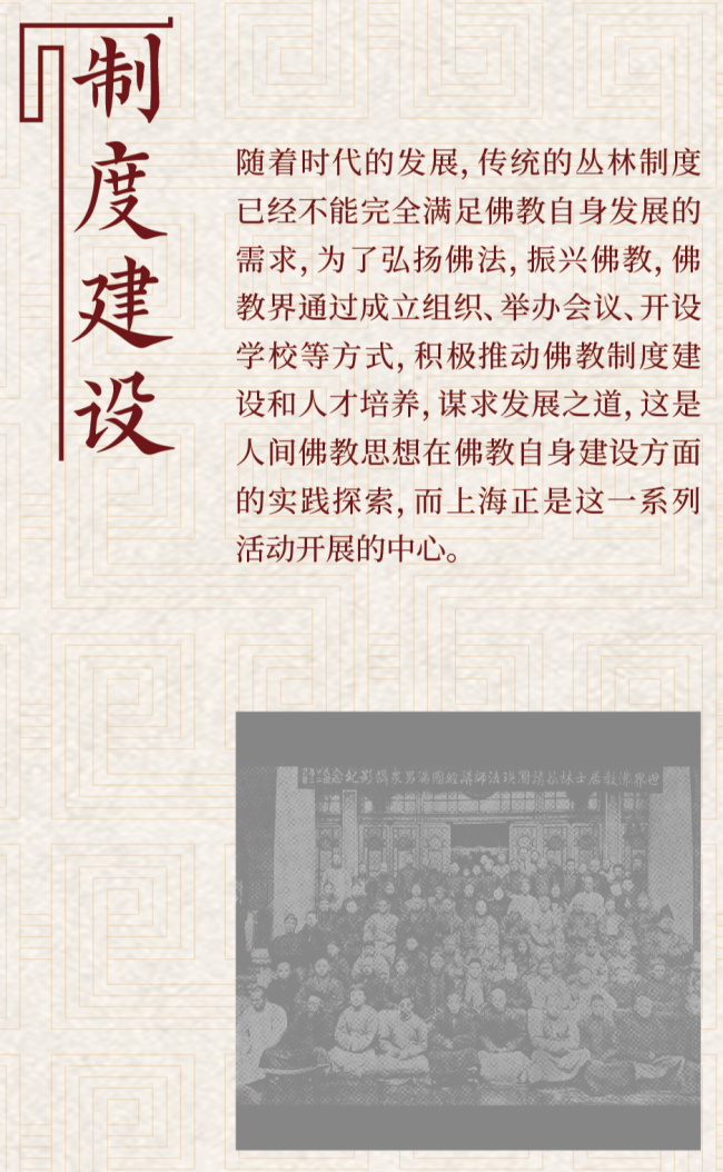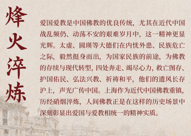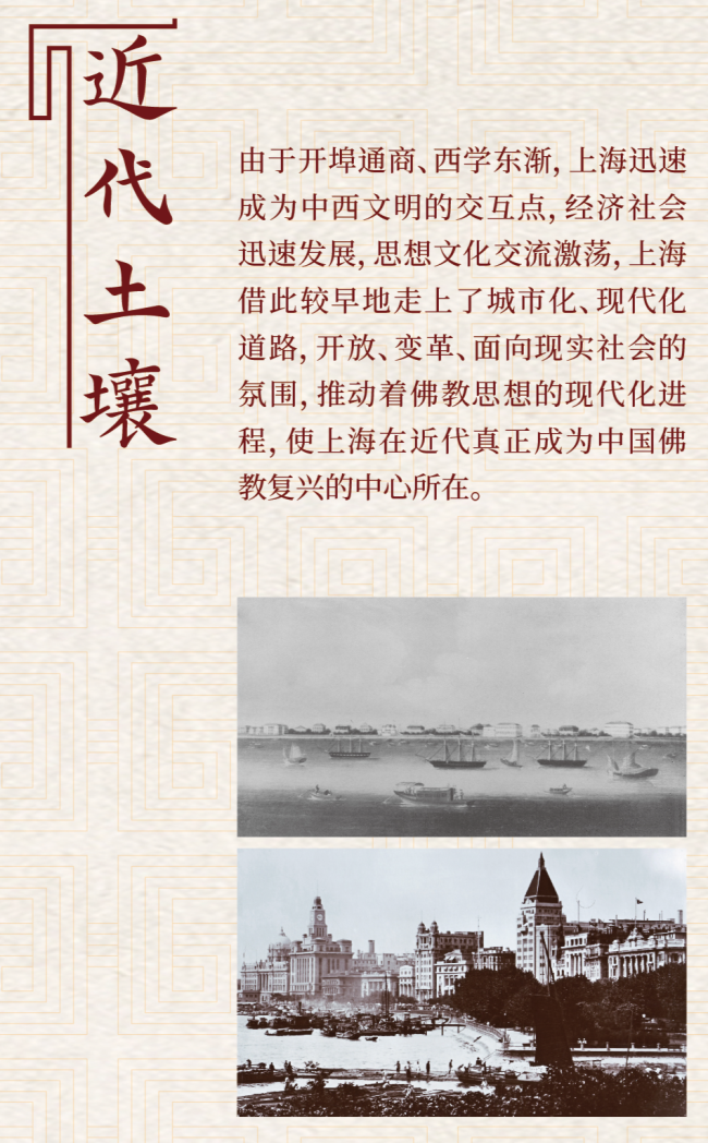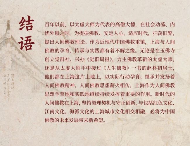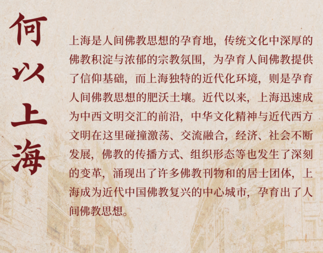 上海佛教源远流长,相传肇始于三国吴赤乌年间,但上海真正成为佛教重镇,乃是百年前的近现代。处在时代浪潮中的佛教面对民族危难、社会剧变和自身的种种问题,迫切需要探索现代化道路,上海作为近现代思想文化交汇碰撞的窗口,以其开放包容的城市精神、多元交融的文化土壤,为诸多有识之士提供了一片广阔的场域。在种种尝试之中,最为重要的、影响最为深远的,就是“人间佛教”思想。