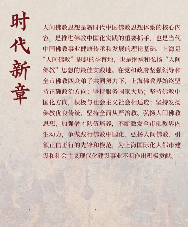 上海是人间佛教思想的孕育地、传承地、实践地。上海见证了中国佛教思想革故鼎新的蜕变,见证了人间佛教思想的孕育诞生与薪火相传。人间佛教思想由太虚大师首倡,经赵朴初居士等大德继承和发扬,已经成为中国佛教发展的指导思想和基本方向。它既是佛教事业健康传承发展的理论基础,又是推进佛教中国化的重要抓手,更是新时代中国佛教思想体系的核心内容。