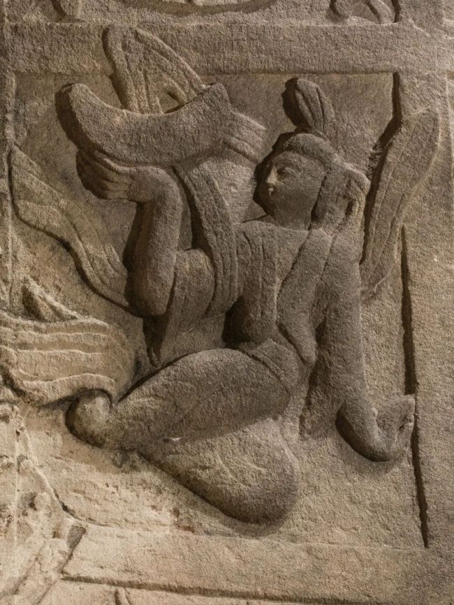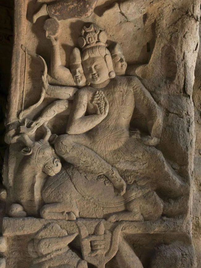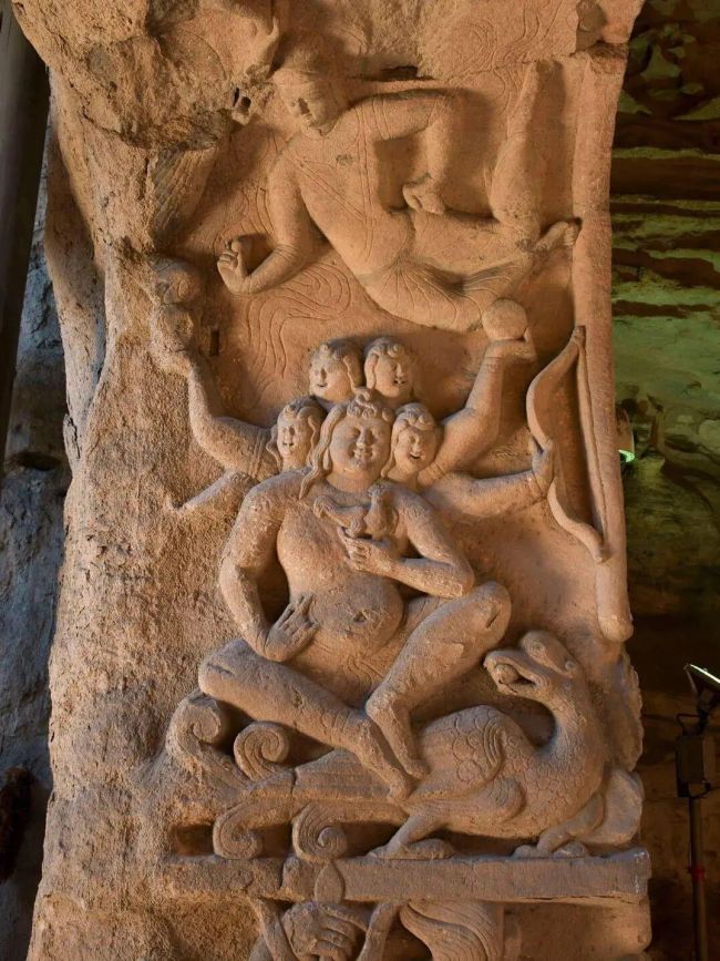 第8 窟窟门西侧五头六臂的鸠摩罗天造像和东侧三头八臂的摩醯首罗天,是云冈石窟中“日月同现” 的两尊代表性形象,其中 “月” 作为造像的重要装饰与神性象征,直接承载在神祇的手臂之上,象征护法祛邪。其中,鸠摩罗天乘着孔雀,其中一只手托举着日,另一只手托举着月,月亮以简洁的圆形造型呈现,与太阳对称分布,从另一种维度展现了云冈石窟对“月” 元素的运用。