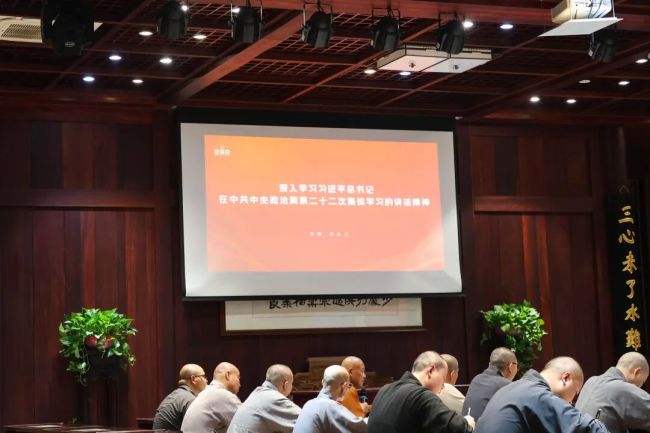 10月7日,苏州寒山寺举行专题学习会,组织全寺执事深入学习贯彻习近平总书记在中共中央政治局第二十二次集体学习时的重要讲话精神,认真领会总书记关于宗教工作的重要论述。